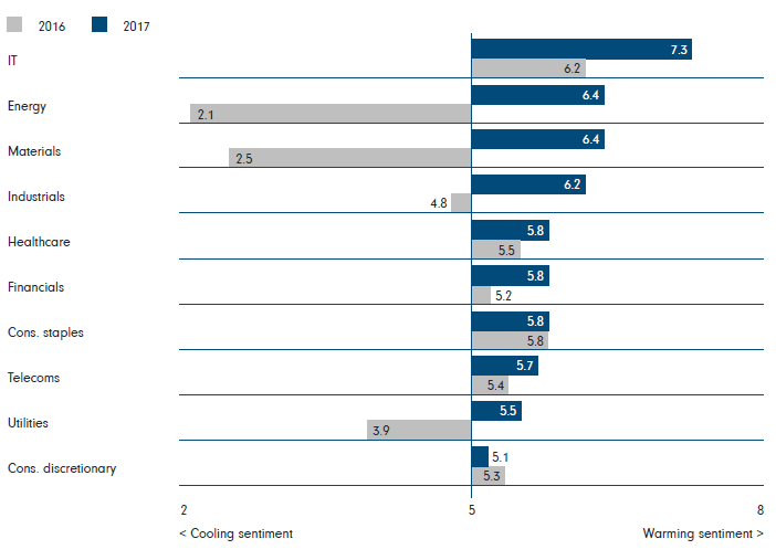 The annual Analyst Survey is a forward looking assessment of sectors and regions built entirely from bottom-up. Fidelity analysts conduct around 17’000 company meetings through the year, talking to CEOs, CFOs and division heads. Their survey provides an aggregate measure of sentiment of the companies they cover with a medium-term view .